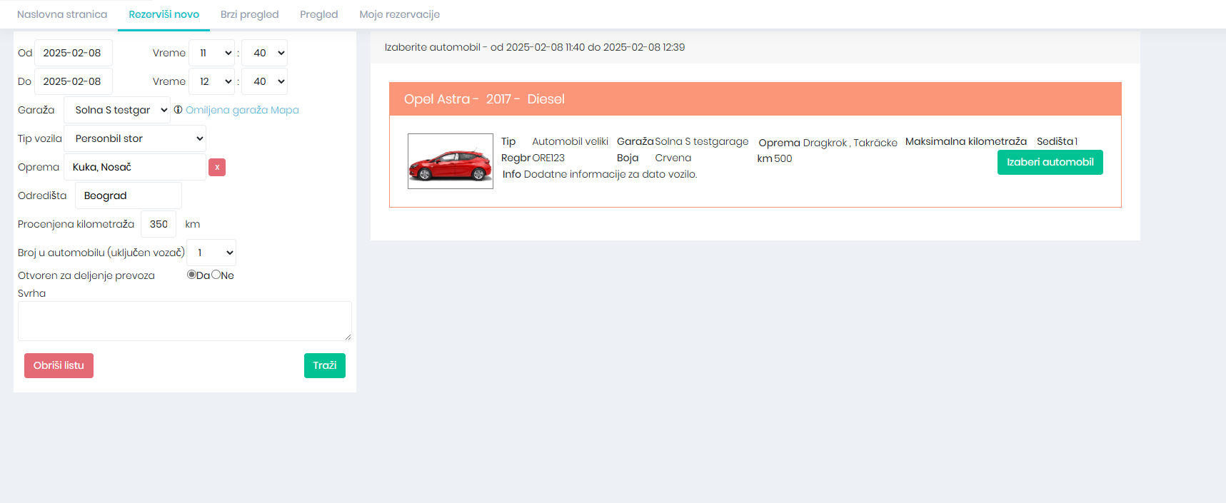 U "Rezerviši" možete, na primer: Izabrati određeni tip vozila (npr. veličinu, gorivo) i opremu (npr. kuka za vuču, krovni nosač) da biste ograničili koji će automobili biti prikazani. Sistem nudi nekoliko načina da se podesi redosled prikazivanja dostupnih automobila kako bi se optimizovala upotreba.